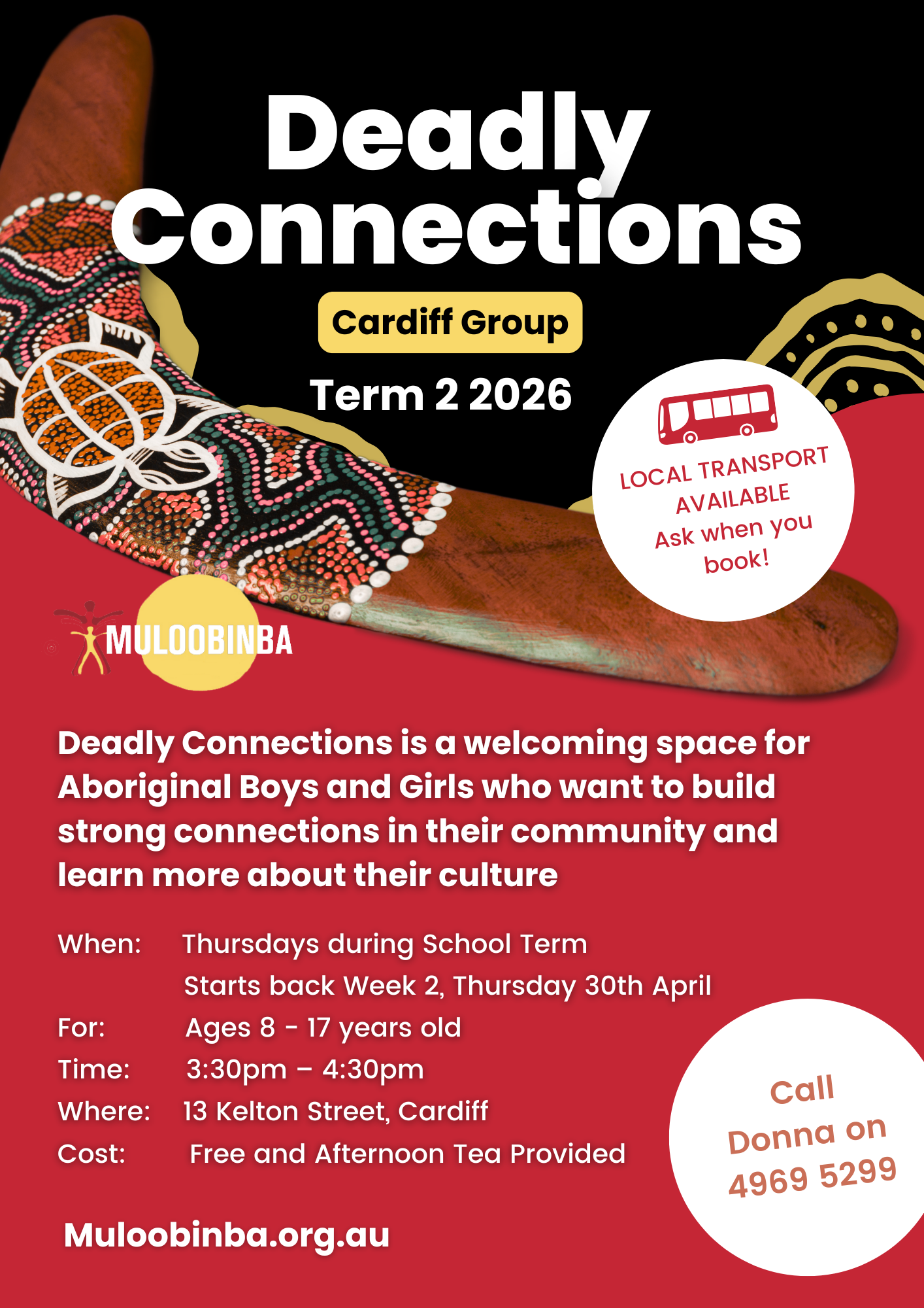 Deadly Connections Thursday 28 May 2026 3:30 pm 4:30 pm Muloobinba Aboriginal Corporation 13 Kelton Street Cardiff, NSW, 2285 Australia (map) Google Calendar ICS