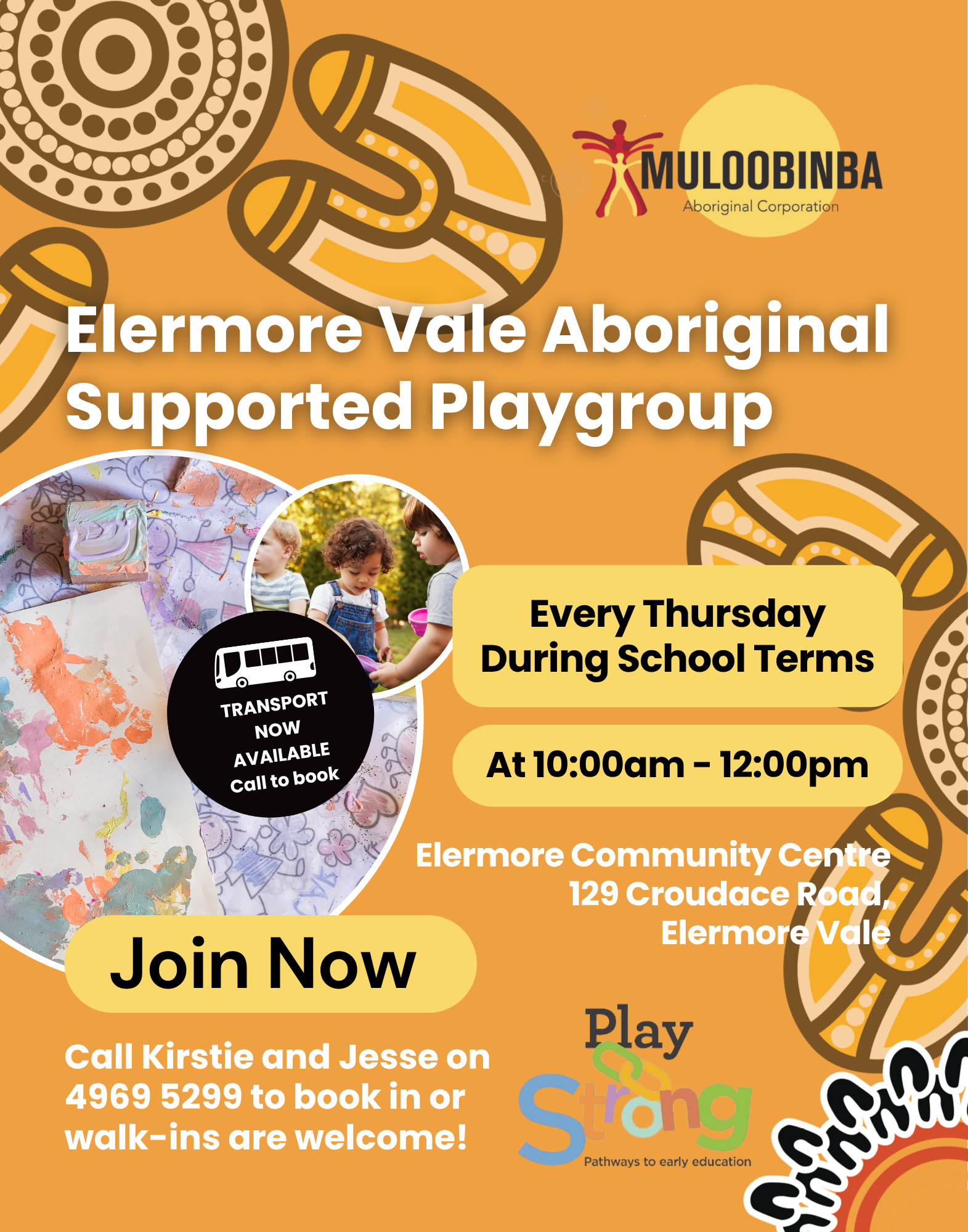 Elermore Vale Aboriginal Supported Playgroup Thursday 25 June 2026 10:00 am 12:00 pm Elermore Vale Community Centre 129 Croudace Road Elermore Vale, NSW, 2287 Australia (map) Google Calendar ICS