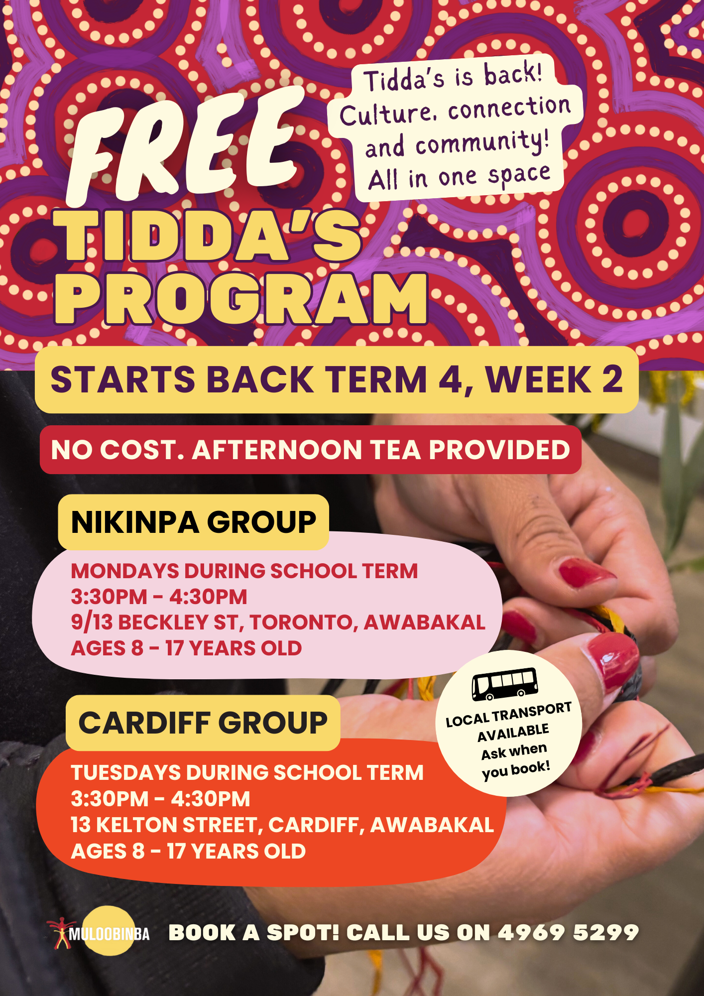 Back to All Events Tiddas Program at Nikinpa Monday 20 October 2025 3:30 pm 4:30 pm Nikinpa Aboriginal Family & Child Care Centre 9-13 Beckley Street Toronto, NSW, 2283 Australia (map) Google Calendar ICS